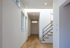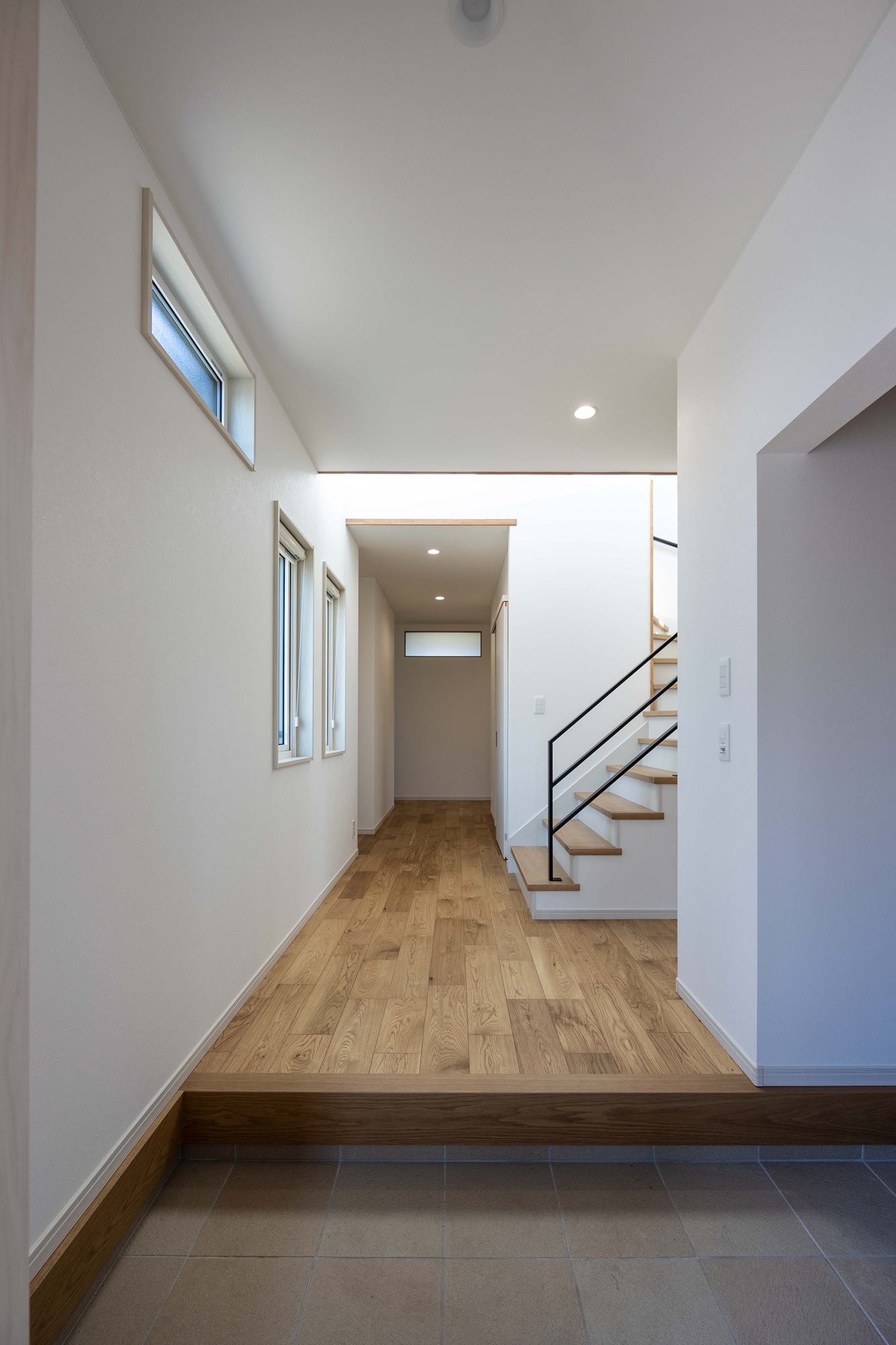 玄関にはプチ吹き抜けを採用し、太陽の光を取り入れ